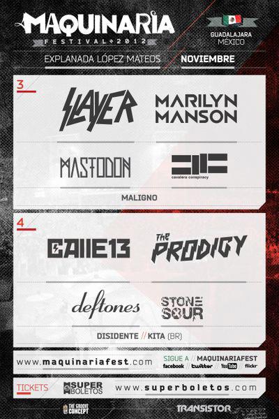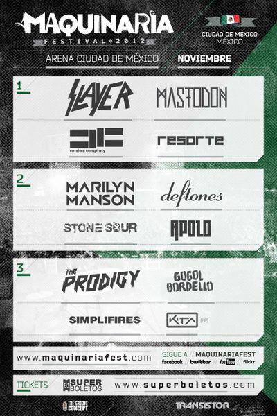 El poderoso line-up de ambas ciudades incluye a Slayer, Prodigy, Cavalera Conspiracy, Mastodon y Stone Sour, mientras que en el DF se suman bandas como Apolo, Simplifires y Gogol Bordello, esta última con una reciente aparición este mismo año en la capital jalisciense. Asimismo, la organización anunció que habrá una «banda sorpresa» en la primera fecha de la Ciudad de México (1 de noviembre).