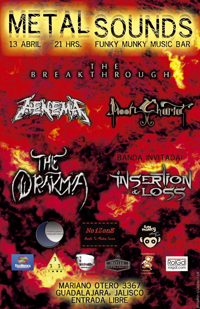 Aunque con estilos e influencias distintas, Insertion Loss, Aenema, Moon Chariot, y The Breakthrough, serán quienes la noche del sábado compartan escenario. «Toda música es buena para apreciarla mientras te mueva y te guste” agrega Jr., vocalista de Aenema.