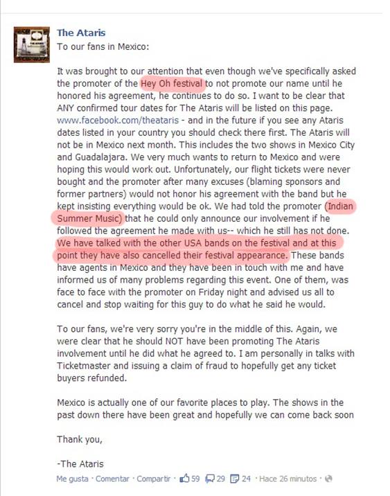 En el mismo comunicado, los organizadores mencionan que el festival también sufrirá algunos ajustes en su line-up, esto debido a ya mencionada cancelación de The Ataris, con quienes, explica el boletín de prensa, no se pudo llegar a un acuerdo final. A su vez, The Ataris publicaron un comunicado a través de sus redes sociales en el que dicen que los promotores no cumplieron con algunas especificaciones acordadas. Lo mismo ocurrió con varias agrupaciones nacionales que firmaron una carta en la que se deslindan de responsabilidades.