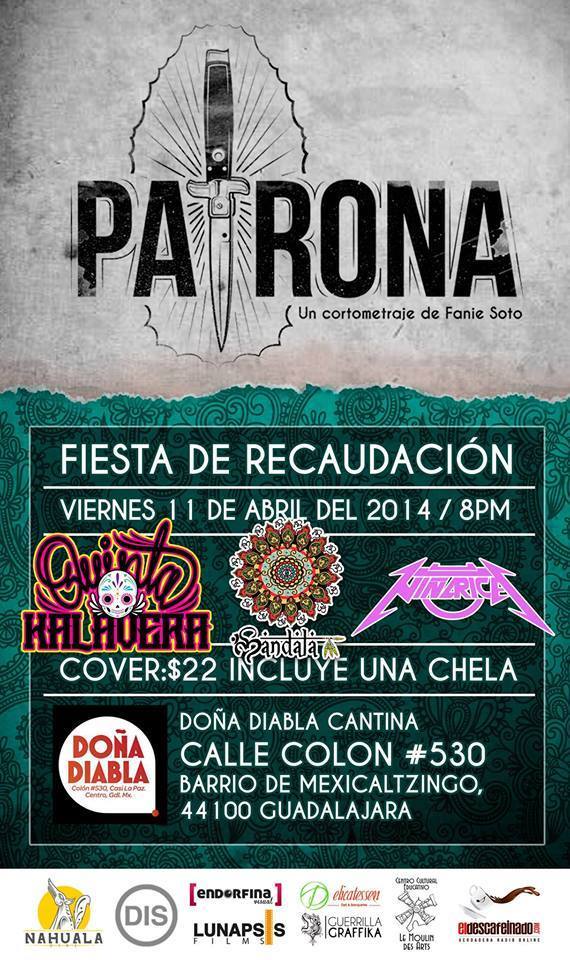 Este viernes 11 de abril en punto de las ocho de la noche en Cantina Doña Diabla -ubicada en Colón 530 en Guadalajara- se llevará a cabo una gran fiesta musical en la que además de los ritmos de La Quinta Calavera, Mandala y Niña Rica, la intención es la de recaudar fondos para la conclusión del cortometraje La Patrona de la cineasta tapatía Fanie Soto, quien plasmado la historia de cómo una obsesión que cambia la vida cotidiana, a partir de un suceso extraordinario de los protagonistas.