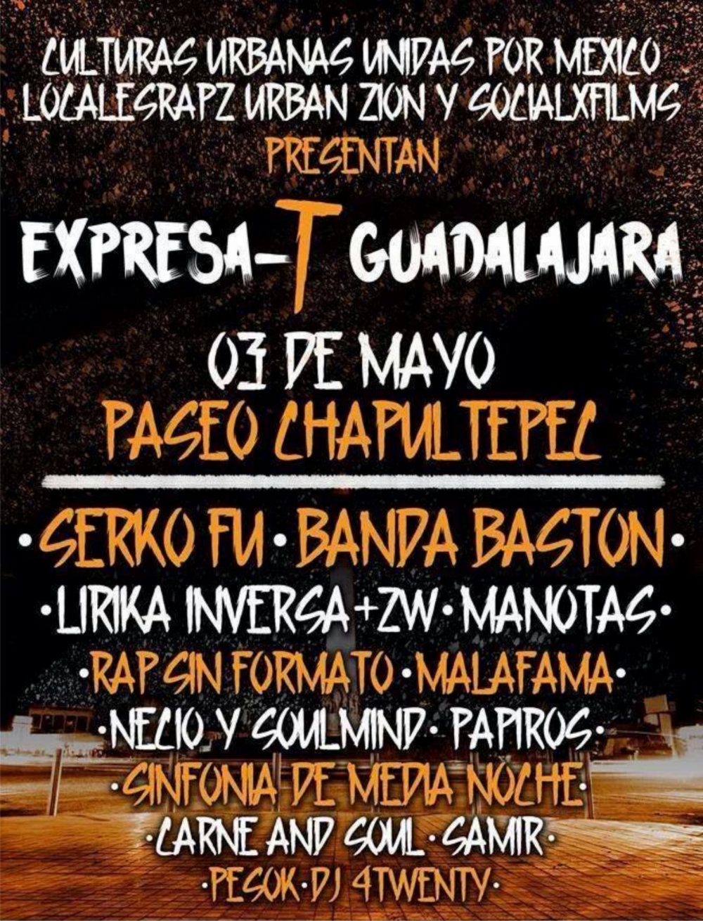 Tras una exitosa alianza entre los colectivos Culturas Urbanas Unidas por México (CUUM), Locales Rapz, Urban Zion y el Ayuntamiento de Guadalajara se presentará Expresa-T, el primer festival de cultura hip hop en la Zona Metropolitana. Un evento que pretende sembrar el respeto de ideologías sonoras y gustos musicales en la urbe tapatía.