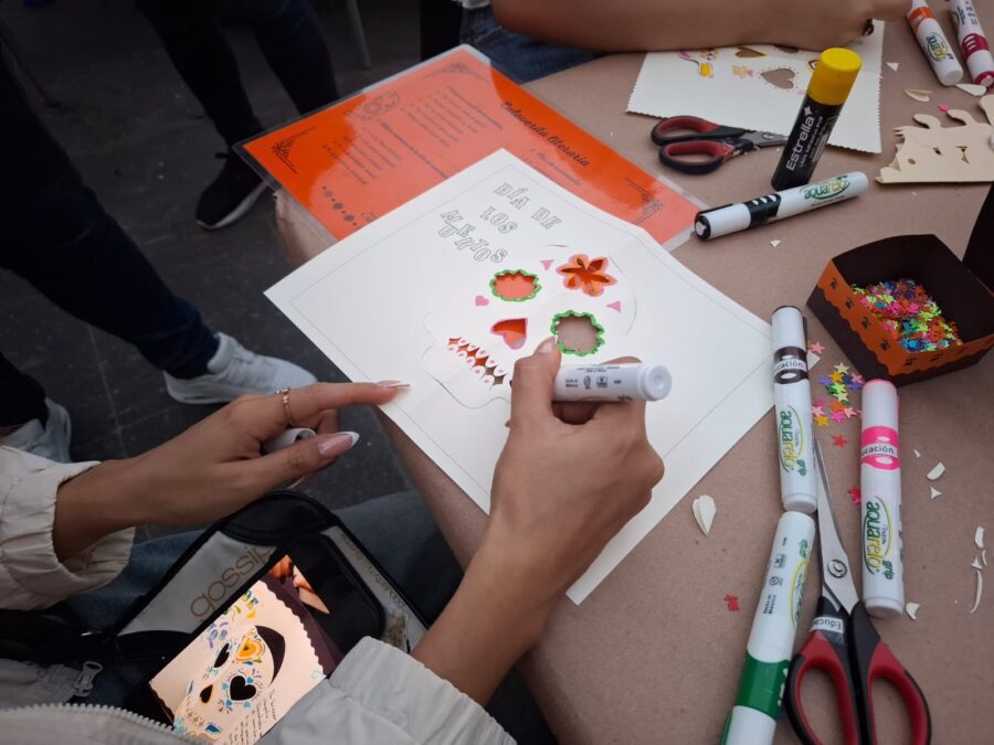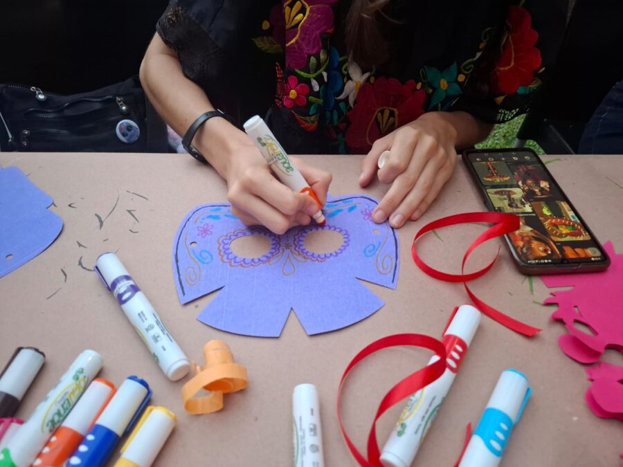 Las actividades comenzaron a las 17:00 horas, en cinco mesas de trabajo se montaron los talleres de elaboración de máscaras de calavera, pintura sobre miniaturas de barro y arcilla, elaboración de papel picado, pop up de calaveritas literarias y una más donde artistas plasmaron la catrina sobre los rostros de las y los asistentes.